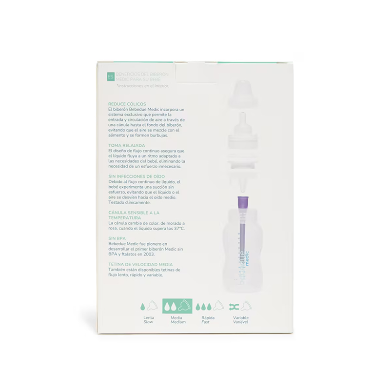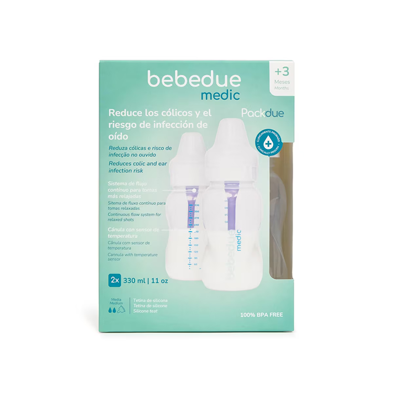 El pack de dos biberones Bebedue Medic 330 ml está diseñado para bebés con mayor capacidad de succión o etapas avanzadas de alimentación. Ofrece la misma calidad y tecnología anticólicos que caracteriza a la línea Medic, en un formato más grande que facilita las tomas completas sin necesidad de recargar.
